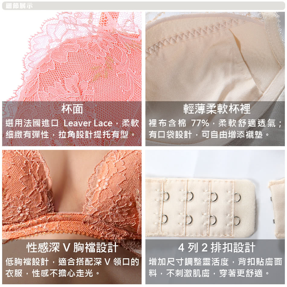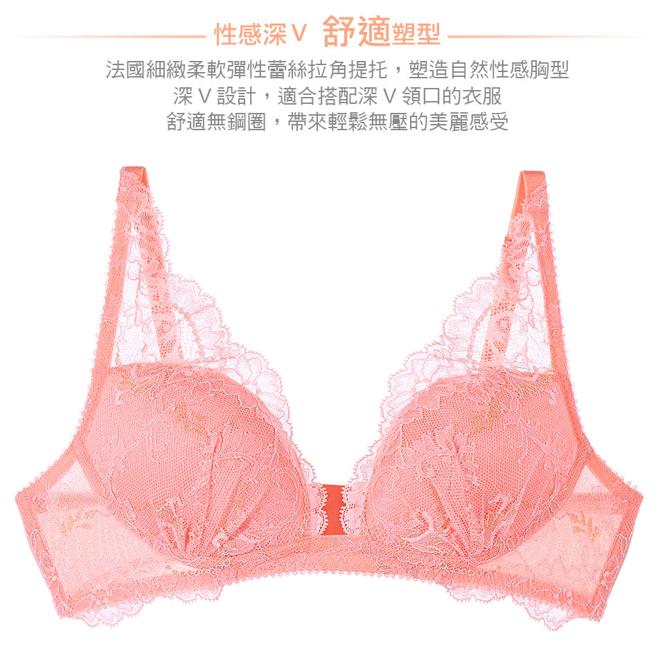 【Lofan 露蒂芬】風雅 法式蕾絲深V無痕無鋼圈Plunge內衣-微漾粉橘(CB1818-ORG)各種罩杯款式種類怎麼看胸部小的人適合穿嗎